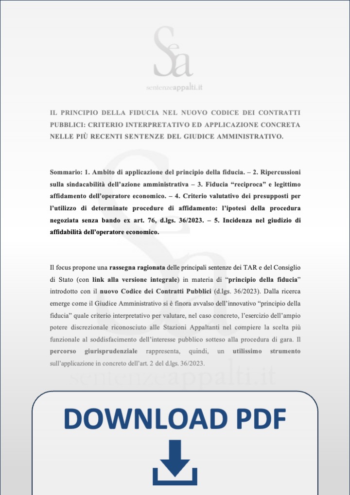 Il focus propone una rassegna ragionata delle principali sentenze dei TAR e del Consiglio di Stato (con link alla versione integrale) in materia di “principio della fiducia” introdotto con il nuovo Codice dei Contratti Pubblici (d.lgs. 36/2023). Dalla ricerca emerge come il Giudice Amministrativo si è finora avvalso dell’innovativo “principio della fiducia” quale criterio interpretativo per valutare, nel caso concreto, l’esercizio dell’ampio potere discrezionale riconosciuto alle Stazioni Appaltanti nel compiere la scelta più funzionale al soddisfacimento dell’interesse pubblico sotteso alla procedura di gara. Il percorso giurisprudenziale rappresenta, quindi, un utilissimo strumento sull’applicazione in concreto dell’art. 2 del d.lgs. 36/2023.